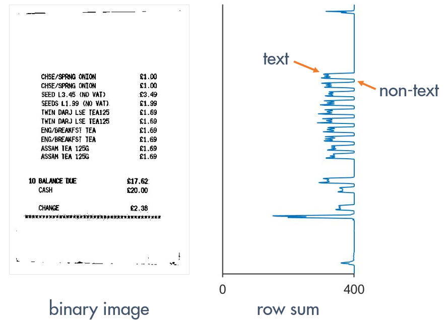 A receipt image has a pattern of horizontal “stripes” of dark text separated by “stripes” of bright paper.