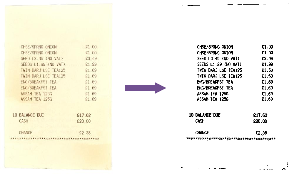 One method is to separate the text from the background. Separating an image into distinct parts is called segmenting an image. original receipt image next to segmented version of the same image