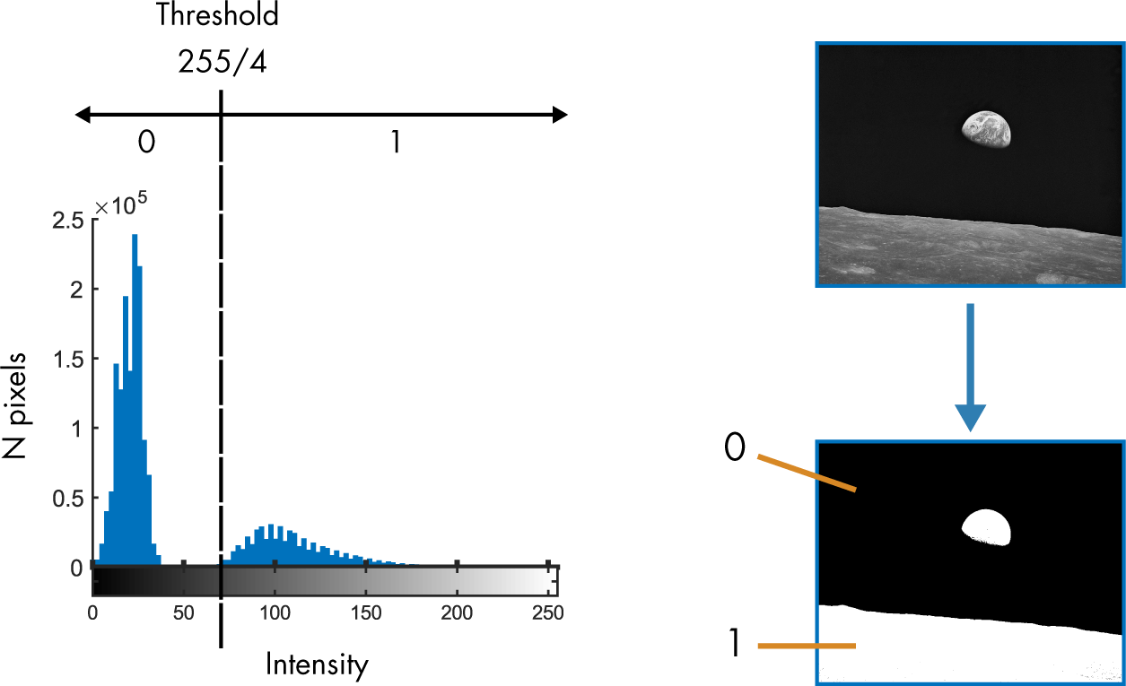 In the example below, a grayscale image is segmented using a threshold of 1/4 the maximum possible intensity of 255.